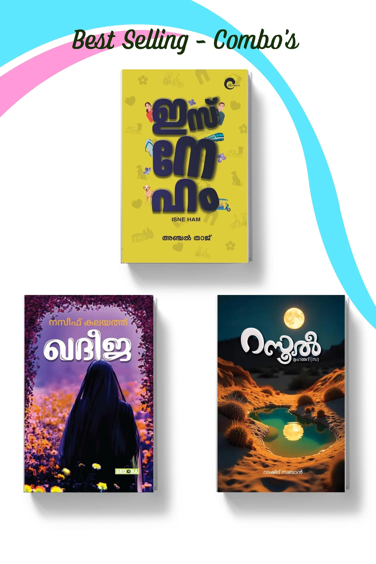 Isneham ഏറെ വിശുദ്ധിയോടെയും അനുരാഗത്തോടെയും സൂക്ഷിച്ച മൈലാഞ്ചിമണമുള്ള പ്രണയത്തിന്റെ കഥ. സ്നേഹം അതിന്റെ ചില വേരിയൻ്റകളെ എനിക്ക് മുന്നിലേക്കും അയച്ചു. അതിൽ ചിലതെന്നെ സ്നേഹിച്ചു, ചിലതെന്നെ ചിന്തിപ്പിച്ചു. ചിലതെന്നെ കൂടുതൽ മനുഷ്യനാക്കി. കൊടുക്കൽ വാങ്ങലുകളിലല്ലാതെ ഭൂമിയിൽ എനിക്ക് ചുറ്റും സ്നേഹമുണ്ടെന്നും സ്നേഹിക്കാൻ മാത്രമല്ലാതെ ചുറ്റിലും സ്നേഹത്തിന് സാധ്യതകളുണ്ടെന്നും അവരെന്നെ ഓർമപ്പെടുത്തി. എൻ്റെ ജീവന് ദൈവം തന്ന സ്നേഹത്തിന്റെ മുഖവുമായി ഞാൻ കണ്ടുമുട്ടിയ മനുഷ്യരെ ഞാൻ എൻ്റെ മനുഷ്യരെന്ന് വിളിച്ചു. ഈ പുസ്തകത്തിലുടനീളം എൻ്റെ മനുഷ്യരെ ഞാൻ നിങ്ങൾക്ക് തുറന്ന് തരുന്നു. ഇതാണ് ഞങ്ങൾ... ഇസ്നേഹം! Khadeeja പ്രണയം വല്ലാത്തൊരു ഹലാക്കാണ്, മനുഷ്യനെ നന്നാക്കാനും മോശമാക്കാനും കെല്പുള്ള എന്തോ ഒന്ന്. അങ്ങനെ അബൂക്കയുടെ ജീവിതത്തിൽ സംഭവിച്ച ആയിഷയെന്ന ആദ്യ പ്രണയത്തിന്റെയും ഖദീജയെന്ന നിത്യപ്രണയത്തിന്റെയും കഥയാണിത്. പറയാതെ, അറിയാതെ അത്രമേൽ ഹൃദയത്തോട് ചേർത്തുവച്ച ഒരുവൾ... പറഞ്ഞും അറിഞ്ഞും അറിയിച്ചും ജീവിതത്തിലേക്കു കടന്നുവന്ന് ജീവന്റെ പാതിയായി മാറിയ മറ്റൊരുവൾ... തെളിഞ്ഞ പുഴപോലെ പ്രണയമങ്ങനെ ഒഴുകുകയാണ്... മിഴിയിണകളും നിശ്വാസവും മൗനവുംപോലും അവർക്കിടയിൽ പ്രണയംതീർത്തു. ഏറെ വിശുദ്ധിയോടെയും അനുരാഗത്തോടെയും സൂക്ഷിച്ച മൈലാഞ്ചിമണമുള്ള പ്രണയത്തിന്റെ കഥ. Rasool അറുപത്തിമൂന്ന് സംവത്സരങ്ങൾ ഒരു പേമാരി പോലെ പെയ്തൊഴിഞ്ഞു പോയി. സംഭവ ബഹുലമായ രാപ്പകലുകൾ. ചരിത്രം ആ ജീവിതത്തിൻ്റെ മുൻപും ശേഷവും എന്ന് അടയാളപ്പെടുത്തി. അറുപതിമൂന്ന് വർഷങ്ങൾ... അപ്പോഴേക്കും അറേബ്യ അക്ഷരവെളിച്ചം കണ്ടു തുടങ്ങിയിരുന്നു. പെണ്ണിന് സ്വത്തബോധവും അടിമക്ക് അവകാശ ബോധമുണ്ടായി. ജനിച്ചു വീഴുന്ന കുഞ്ഞിനും മരിച്ചു കിടക്കുന്ന മയ്യത്തിനും പരിഗണനയുണ്ടായി. നീതിയും ധർമ്മവും പുലർന്നു. ആ വെളിച്ചമേറ്റ് മരുഭൂമി പോലും നിറമുള്ളതായി. ആ നിറം കടലിടുക്കുകൾ കടന്ന് ലോകത്ത് പടർന്നു.