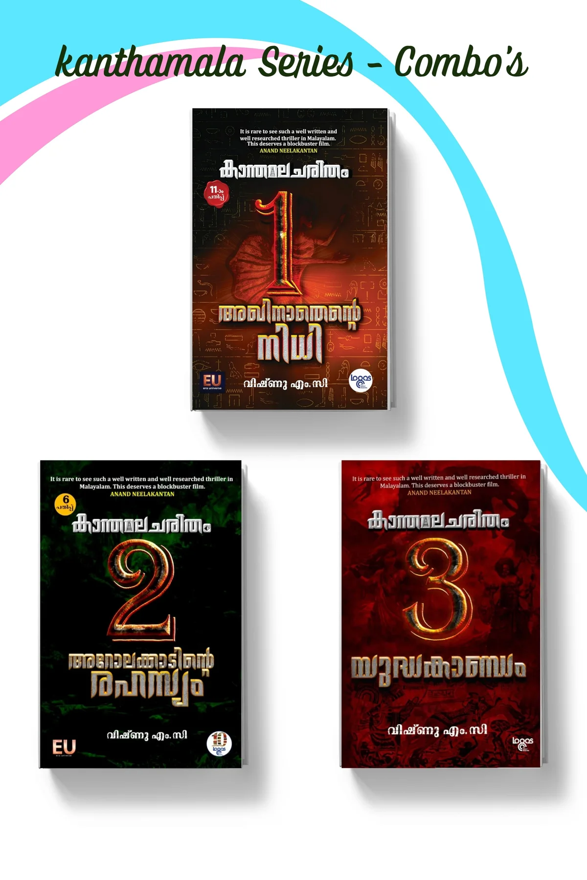 Kanthamala Charitham 1 ഭൗതിക ജീവിതത്തിന്റെ കാമനകളും അധികാരത്തിന്റെ ആസക്തിയും ആത്മീയതയുടെ ഔന്നിത്യവും എല്ലാം ഉള്ക്കൊള്ളുന്ന അനവധി കഥാപാത്രങ്ങള് ഇതില് തിളങ്ങി നില്ക്കുന്നു. -എ. ഹേമചന്ദ്രന് (Rtd. DGP) ശബരിമലയില് തുടങ്ങി അങ്ങ് ഈജിപ്തിലേക്ക് കഥകള് കോര്ത്ത് കോര്ത്ത് പോകുന്ന ആ അപാര ധൈര്യം സമ്മതിക്കുന്നു. -അമല് (നോവലിസ്റ്റ്) Kanthamala Charitham -2 നോവൽ ഓരോ ദ്രാവിഡന്റേയും ഉള്ളിൽ തറഞ്ഞ കേൾവിയാണ് അയ്യപ്പചരിതം. കെട്ടുകഥകളും, കേട്ടകഥകളും, തോറ്റങ്ങളും, ചരിത്രരേഖകളും സാധ്യതകളാക്കി, ഒരു സാഹസികന്റെ മനസ്സോടെ വിഷ്ണു കഥയുടെ മലകൾ കയറുന്നു. എന്നും തിരികെ വിളിക്കുന്ന കാടകങ്ങളിൽ തെളിയുന്ന ജ്യോതിസ്സുകളും ആകാശം കാക്കുന്ന ഗരുഡനുമൊപ്പം പുരാതനമായ മറവികളെ വായനയുടെ മുടിയിലേറ്റുന്നു. ഇനിയും ഒരു നൂറു കഥകൾ കണ്ടെത്താൻ പടികൾ ഉയരെയുണ്ട്. ഇത് വിഷ്ണുവിന്റെ ഭാവനയുടെ പെരുവിരലടയാളം. - ശങ്കർ രാമകൃഷ്ണൻ തിരക്കഥാകൃത്ത്, സംവിധായകൻ Kanthamala Charitham 3 അറോലക്ഷേത്രത്തിനകത്തെ ഇരുട്ടുമുറിയുടെ മദ്ധ്യത്തിലുള്ള ടാങ്കിനുള്ളിൽ അയ്യനാർമണി തിളങ്ങാൻ തുടങ്ങി. പച്ചയിൽനിന്നും കല്ലിന്റെ നിറം സാവധാനം നീലയിലേക്ക് മാറി. അപ്പോൾ അറയുടെ മൂലയിൽ സ്ഥിതിചെയ്യുന്ന 'നച്ചിത്തിരവിഴി'യും നീലനിറത്തിൽ വെട്ടിത്തിളങ്ങാനാരംഭിച്ചു. പ്രപഞ്ചത്തിലെ നിറങ്ങളത്രയും നീലയിലേക്ക് സന്നിവേശിപ്പിച്ച് അയ്യനാർ മണിയുടെ തിളക്കം പതിയെപ്പതിയെ അനന്തവിഹായസ്സിലേക്ക് പടർന്നു. ഐതിഹ്യവും ചരിത്രവും വിശ്വാസവും കെട്ടുകഥകളും ഇടകലരുന്ന മിസ്റ്റിക് ത്രില്ലർ ട്രിലജി കാന്തമലചരിതത്തിലെ അവസാന പുസ്തകം.